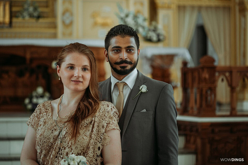 Lidia and Joseph’s wedding was a sacred union where two completely unrelated cultures had seamlessly combined into one. It was a beautiful Christian wedding with local Indian elements thrown in it. While Joseph looked dapper in a tuxedo, Lidia was resplendent in a golden Indian wedding saree. The Kerala Christian matrimony rituals were a feast to the eyes.
