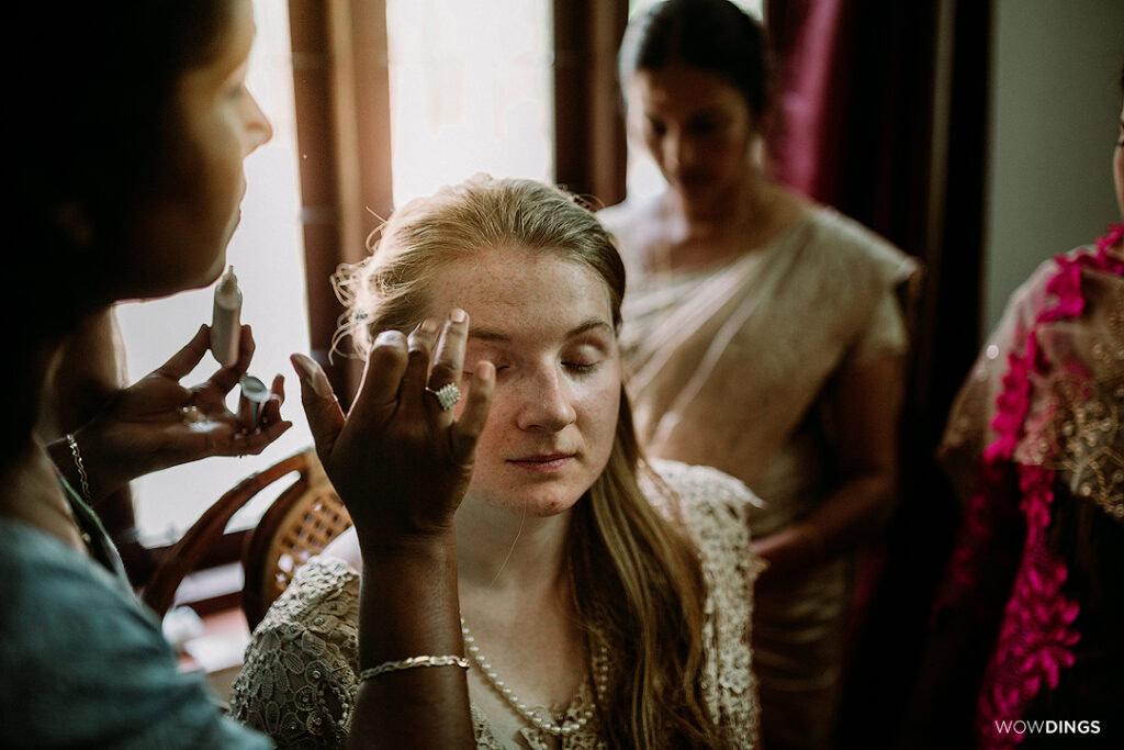 The night before the marriage, at the groom’s house, the Madhuram Veppu was conducted. The bride /groom was placed in a special seat and then the prayers were done and the uncle of the groom asked the group of close relatives, whether he shall give the bride/groom the sweet. It was asked three times and then sweet was given to the bride and the groom. The ceremony ended with a small house party with lots of food, dances, and laughter, while Lidia put on her Mehndi.