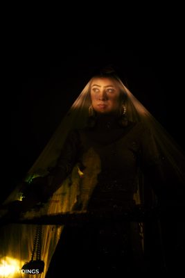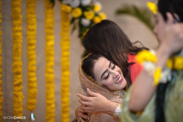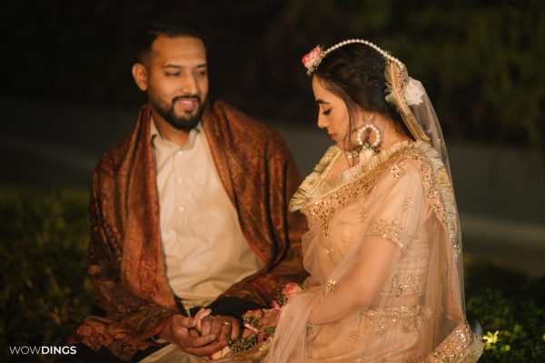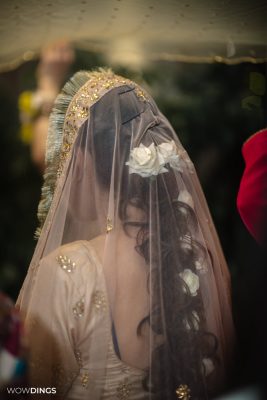Mayun ceremony in muslim weddings announces the beginning of a half-week long celebration of  joyous wedding festivity. With the mercury dropping quite a few notches in the outskirts of the capital, in the cosy setting of a warm hall, Tanzeela’s wedding begins with the Mayun ceremony;  a celebration involving turmeric paste, vibrant marigold garlands, sweet scent of rose petals,  and the soft hum of traditional Sufi melodies. Her sisters—Batool, Anam, Nabeela—move gracefully around the hall, their own attire reflecting the joyous hues of the occasion. Each carries a small brass bowl containing the ‘uptan’, a fragrant paste of turmeric, sandalwood, and herbs, prepared lovingly by the women of the household. Her little nieces and nephew, a bundle of energy and excitement, attempts to mimic their actions, her giggles adding a lighthearted charm to the ritual . The arrival of Tanzeela- the awestruckingly gorgeous bride is  awaited by both the families. Draped in a simple yet elegant embroidered powder pink sharara, embodying the purity and anticipation that the Mayun ceremony signifies, Tanzeela appears at the gate, and our heart skips a beat at the sight of her beauty. Her sister Batool, carefully adorns her with the flower jewellery. Abraz, her handsome groom waits with bated breath in anticipation of his long cherished dream to come true, to see the love of his life finally turning into his bride.