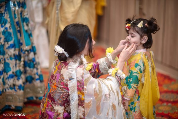 The groom Abraz’s  mother initiates the ceremony. With gentle hands, she applies the first touch of ‘uptan’ to Tanzeela’s cheeks, a symbolic act of blessing and beautification.