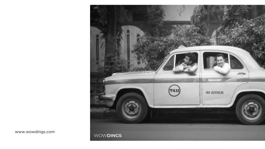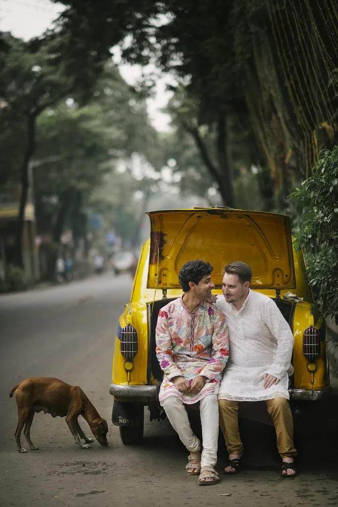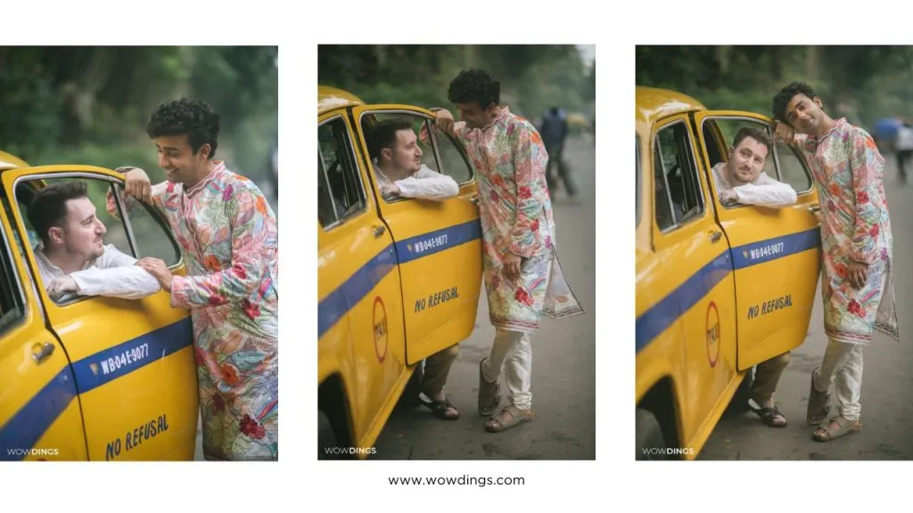 same sex pre-wedding photography by Adusyanti Chatterjee in old Kolkata—with yellow taxi.